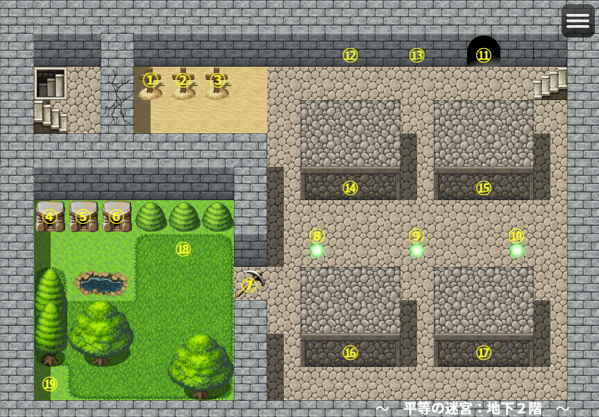最初から見えている洞窟。地面に地下3階へ続く穴が空いている。ここで縄ばしごを設置すると、地下3階へ行けるようになる。また、「上限レベル」が1増える。